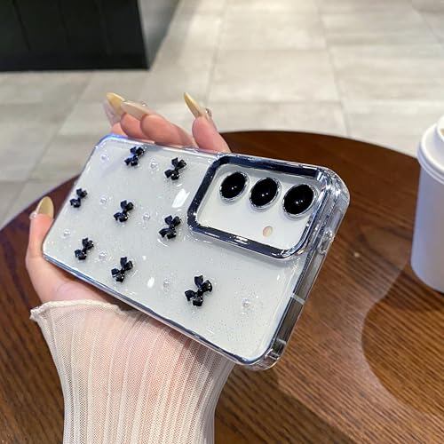 QLTYPRI 対応 Galaxy A55 5G ケース クリア シルバー ミニリボン おしゃれ 韓国 透明 可愛い 耐衝撃 SC-53E スマホケース 立体 りぼん装飾 きらきら ギャラクシーA55 ケース 6.4インチ 対応 - ブラック