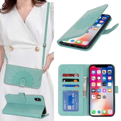 Cavor iPhoneXSスマホケース 手帳型iPhoneX ショルダー ケース 肩掛け首かけ斜めがけショルダー ケースiPhoneX手帳型 ケースアイホンXSケースカード収納 iPhoneX 財布型ケースiPhone10 財布型ケース CASE【ウォレット機能】可愛 磁気機能クロスボディケース 横置-ネーグリーン