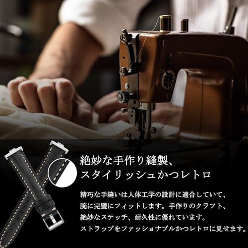 [レトロでクラシックなデザイン] クラシックなステンレススチールのバックルが特徴です。精巧な手縫いは人体工学の設計に適合していて、腕に完璧にフィットします。手作りのクラフト、絶妙なステッチ、耐久性に優れています。ストラップ全体をレトロな雰囲気に仕上げます。多孔のデザインで簡単に装着できて、腕の長さに合わせて革腕時計バンドの長さを調節できます。取り付け・取り外すの工具は必要ありません。