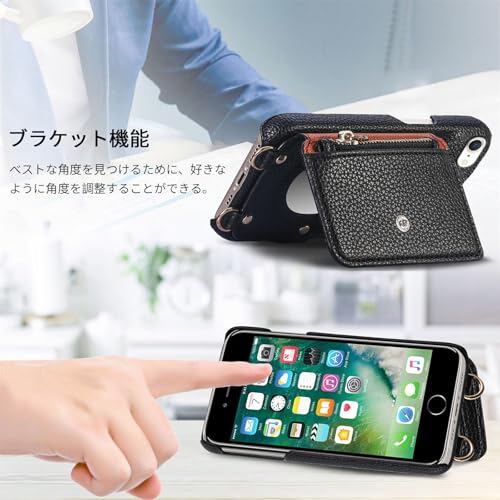 Kitzomi 携帯ケース iPhone SE 手帳型 第2世代/第3世代 iPhone7 iPhone8ケース 手帳型 背面フリップ 左右開 携帯ケースに鏡付きコインポケット ストラップ付き カード 収納 小銭入れ ファスナーポケット付き[ブラック]