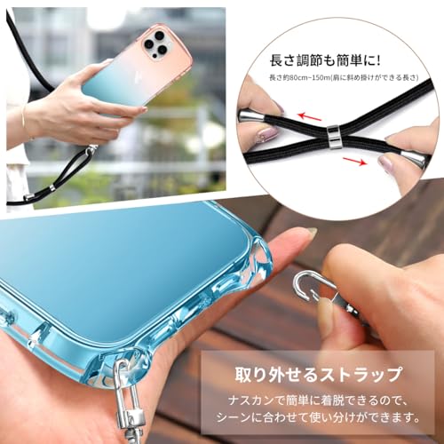 iPhone16 Pro 用 ケース クリア グラデーション色 ショルダー ストラップ付き iPhone 16 Pro 用 カバー 透明 肩掛け 斜めかけ 縄掛け TPU 韓国 可愛い 耐衝撃 全面保護 薄型 アイフォン16 プロ 用 スマホケース (ライトブルー/オレンジ)