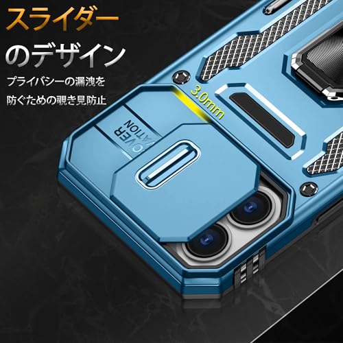 YULNCUZ iPhone 17 対応 金属リングスタンド付き スライド式カメラカバー ケース 磁気車載対応 耐衝撃 MIL規格認証 レンズ保護 スタンド機能 衝撃吸収 縦横両用 滑り止め 指紋防止 防塵 6.3インチ 青 K325