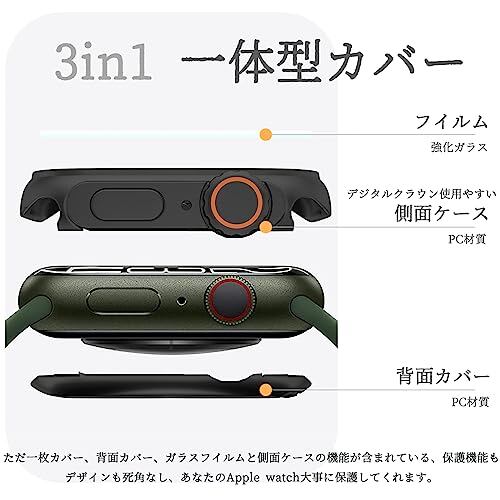 【3in1一体型カバー→背面カバー+ガラスフイルム+側面カバー】硬度9HガラスフィルムとPC材質枠革新的な3in1一体型デザイン。ただこの一枚カバーて、背面カバー、ガラスフイルムと側面ケースの機能が含まれている、保護機能もデザインも死角なし、あなたのApple watch大事に保護してくれます。強化ガラスが採用されていますので、アップルウォッチの液晶をしっかり保護してくれます。ケースはPC材料使用おり、防衝撃はとても強いです。落下、衝撃、擦れ傷など一切心配ありません。