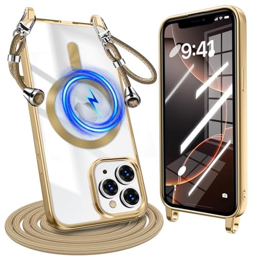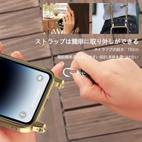 iPhone 16 Pro Max 用 ケース クリア ショルダー 耐衝撃 アイフォン 16 プロ マックス 用 ケース Magnetic対応 ストラップホール付き 肩掛け 紐付き TPU 斜めかけ 縄掛けケース 長さ調整可能 取り外し可能 落下防止 紛失防止 軽量 一体型 ワイヤレス充電対応 メッキ加工 アイフォン 用 カバー 金 W-CXKS-10-03