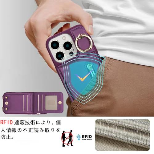 Jcxtrombulous対応 iPhone 15 Pro ケース 背面カード マグネットICカード収納 調節可能なストラップ付き 耐衝撃な 携帯ケース アイホン15 プロ スマホ PUレザー スタンド RFIDブロッキング技術ケース 6.1inchパープル