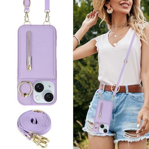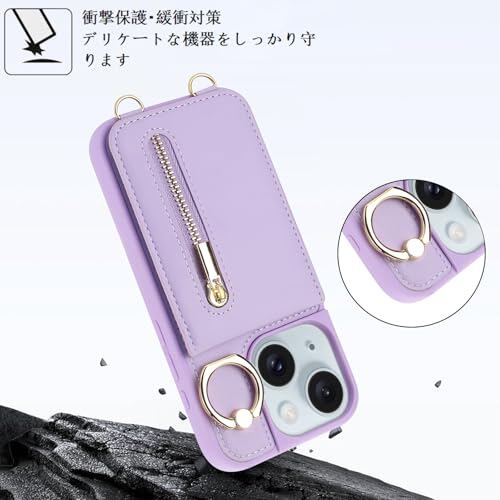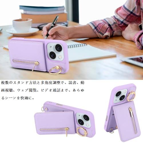 Jcxtrombulous対応 iPhone 13/14 ケース 背面カード マグネットICカード収納 調節可能なストラップ付き 耐衝撃な 携帯ケース アイホン13/14 スマホ PUレザー スタンド RFIDブロッキング技術ケース 6.1inchミスティ・パープル