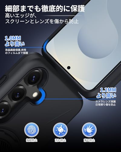 For Galaxy S25/S24用ケース Magsafe対応 多機能360度回転スタンド 耐衝撃 米軍MIL規格 ワイヤレス充電可能 TPU+PC カバー 防指紋 リング マグネット搭載 アイフォン17 用 カバー 黒 D638-s25-01