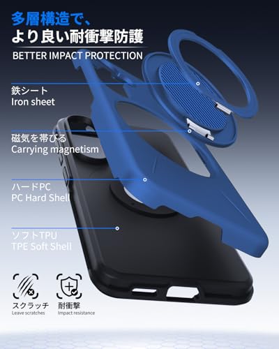 For Galaxy S25/S24用ケース Magsafe対応 多機能360度回転スタンド 耐衝撃 米軍MIL規格 ワイヤレス充電可能 TPU+PC カバー 防指紋 リング マグネット搭載 アイフォン17 用 カバー 青 D638-s25-03