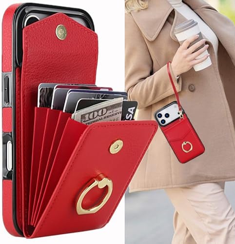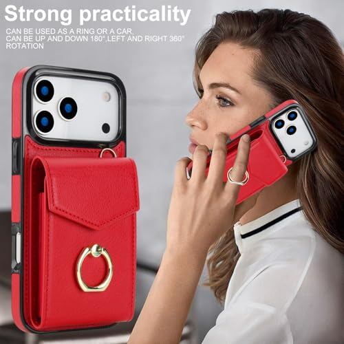 GOKIGIOD 適用 iPhone 17 pro max ケース リング付き 背面 財布型 カード入れ いphone17promax リング カバー ストラップ アイフォン 17 プロ マックス スマホケース 背面ポケット カード収納 可愛い お洒落 RFIDスキミング防止機能 カードポケット ハンドストラップ 縄掛け 携帯カバー レッド red