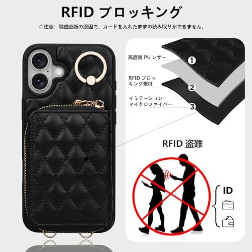 【Keallce】 iPhone 16 ショルダー ケース 手帳型 いphone16 背面収納 iPhone16 ショルダーケース 肩掛け 斜め掛け ストラップ付き カード収納 小銭入れ ファスナー PUレザー RFIDスキミング防止 リング付き 全面保護 女性向け おしゃれ 贈り物 ブランド アイフォン16 財布型 6.1inch ブラック