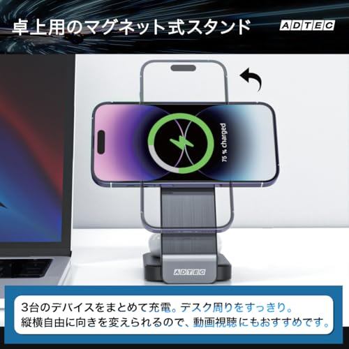 アドテック 3in1 ワイレス マグネット式充電器 高速15Wワイヤレス Phone15/14/13/12 アップル Watch ワイヤレスイヤホン コンパクト 小型 AWPD-V015MEW-BM