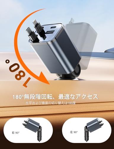 巻き取り式充電ケーブル 車:巻取り式ケーブルは絡まる心配がなく、車内の整理整頓に役立ちます。3cmから80cmまで自在に伸縮でき、前後座席の方々も快適に充電が可能です