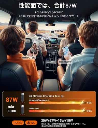4台同時高速充電器 車:巻き取り式充電ケーブル 2本付き(Type-C 30W/Lightning 27W)、2つのUSBポート(USB 15W/Type-C 15W)、4台のデバイスを同時に充電できます