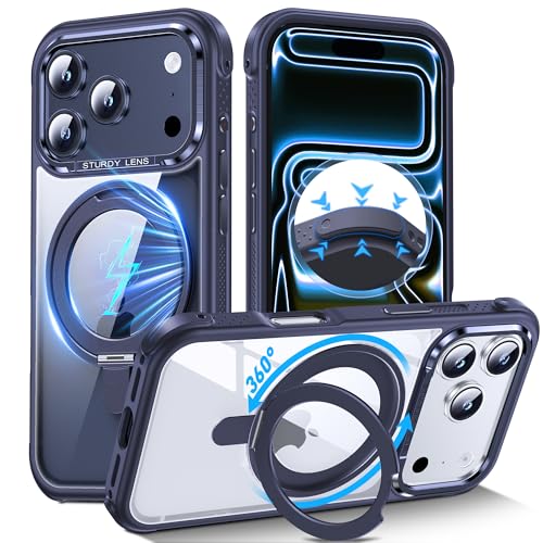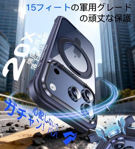 DASFOND iPhone 17 Pro 用 クリアケース 360°回転マグネットスタンド [MagSafe対応] 黄ばまない透明ハードPCバック 滑り止めバンパー 耐衝撃保護電話カバー iPhone 17 Pro ダークブルー
