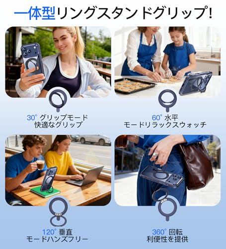 [360°リング式多用途キックスタンド] キックスタンド、リングスタンド、マグネット式の3つの機能が一体になったiPhone 17 pro ケース。アルミ合金リングと金属シャフトが、あらゆる角度でしっかりと固定します。優れた素材と堅牢な構造を採用したこのキックスタンドは、3万回の厳しいテストに合格し、耐久性、堅牢性、そして耐久性に優れています。Oリングは、カメラボタン操作時にスマートフォンをしっかりと固定し、リングホルダーとしても機能するので、忙しい時でもスマートフォンを操作できます。