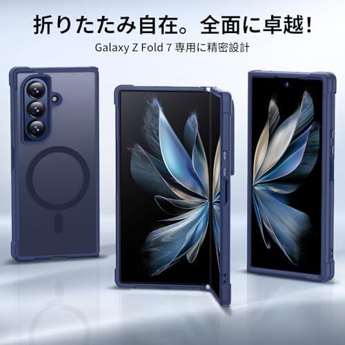 Aunote Galaxy Z Fold7 ケース MagSafe対応 ワイヤレス充電 マット 半透明 ヒンジ保護 米軍MIL規格 耐衝撃 マグネット搭載 ストラップホール付き 指紋防止 レンズ保護 Samsung Z Fold7 スマホケース カバー ブルー