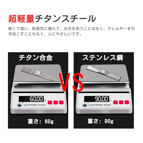 【高級チタン合金製】チタン合金の密度はステンレス鋼より大幅に低く、長時間着用でも疲れにくい。硬度はステンレス鋼の約5倍で、衝撃や摩擦に強く、変形しにくい特性を持つ。