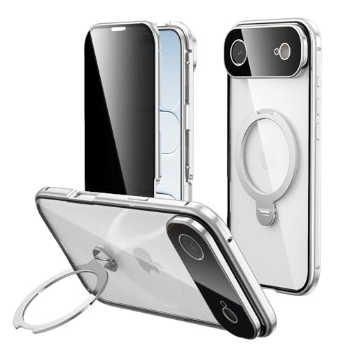 【スタンド機能付き・360°定点回転】覗き見防止 iPhone17 Air 用 ケース クリア ロック付き MagSafe対応 9H強化ガラス PC背面 一体型レンズ保護 両面 アルミバンパー メタルフレーム ワイヤレス充電対応 アイホン17プロマックス 用 カバー スマホケース,シルバー