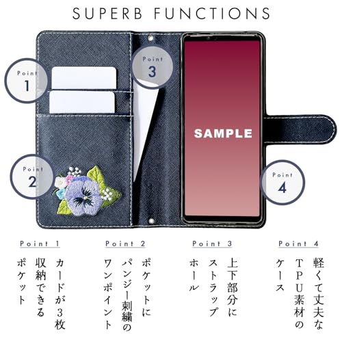 内側にはカードなどが収納できるポケット付きの、実用的なハンドあり手帳型ケースです。高級感のあるサフィアーノ調生地に華やかで上品なオリジナルデザインのパンジー刺繍を施しています。ストラップ穴付きのため、チェーンを付けたりストラップを付けることが可能となります。