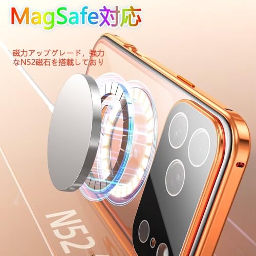 【スタンド機能付き・360°定点回転】覗き見防止 iPhone17 Pro 用 ケース クリア ロック付き MagSafe対応 9H強化ガラス PC背面 一体型レンズ保護 両面 アルミバンパー メタルフレーム ワイヤレス充電対応 アイホン17プロマックス 用 カバー スマホケース,オレンジ