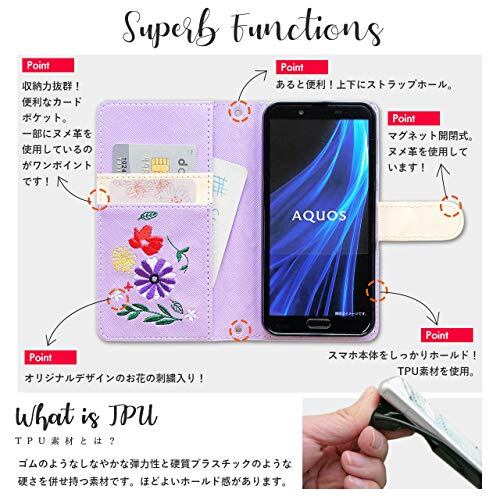 AQUOS sense SH-01K SHV40 lite SH-M05 Android One S3 手帳型 ケース カバー SH01K SH-01Kケース SHV40ケース SH01Kケース SH-M05ケース 手帳ケース 手帳型ケース スマホケース ヌメ花刺繍 パープル