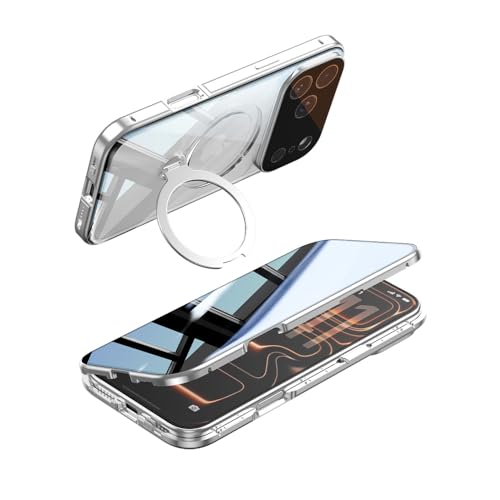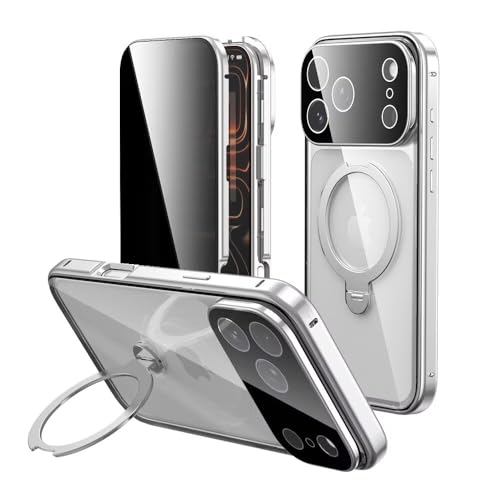 【スタンド機能付き・360°定点回転】覗き見防止 iPhone17 Pro Max 用 ケース クリア ロック付き MagSafe対応 9H強化ガラス PC背面 一体型レンズ保護 両面 アルミバンパー メタルフレーム ワイヤレス充電対応 アイホン17プロマックス 用 カバー スマホケース,シルバー