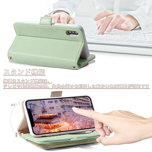 iPhone 15 スマホケース アイフォン 15 財布型 携帯カバー小銭入れ iPhone 15 手帳 ケース 楕円形ミラー付き おしゃれ スマホ カード収納 かわいいアイフォン15 ケース 手帳型 電話ケース あいふぉん 15 財布型 マグネット式 落下防止 TPUカード収納 スタンド機能 長さ調整可能(グラスグリーン)
