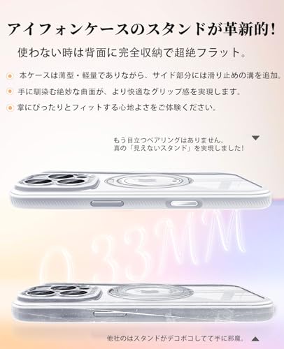 【対応機種&製品特徴】 For iPhone 17 ProMaxケース(6.9インチ)。360度回転スタンド付き、マグネット搭載でMagSafe対応、このアイフォンケースのハイライトは取り外し可能なカメラカバー・御洒落でキラキラ・クリア背面・肌触りオイル塗装で黄変防止&汚れ防止、機能性と保護性能を両立したこだわりのiPhoneケース。商品について御不明な点や不具合がございましたらいつでもお気軽に連絡ください。
