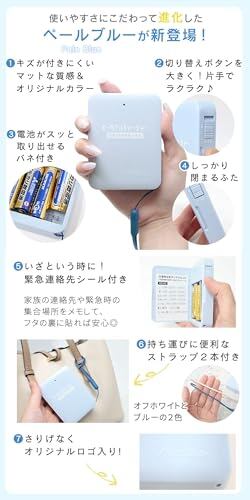 【使いやすさを追求した設計】 ペールブルーの新仕様では、マットな質感で手に馴染みやすく、握りやすさとデザイン性を両立。滑り止め付きの背面、片手でも簡単に切り替えられる大きなスイッチ、取り出しやすい電池ホルダーなど細部にまでこだわった仕様。通電中は赤いランプが点灯する安心設計で、使っているかどうかも一目瞭然。本体にはオリジナルロゴ入りで見た目もおしゃれ。災害時だけでなく、日常使いにもピッタリのデザイン性を備えた便利バッテリーです