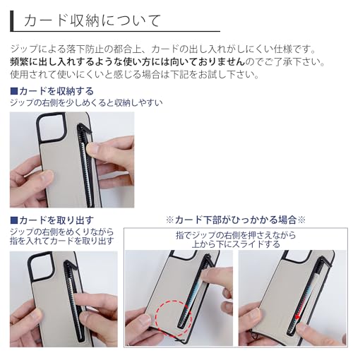 【ジップ付のカード収納】ジップ付きで、落下の心配がないカード収納付き。カードは2枚程度まで収納可能。カード以外にも、小銭やお札なども収納可能です。※ICカードを収納される場合は、別途改札エラー防止フィルム(別売)をお買い求め下さい。