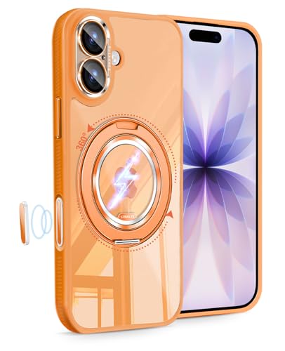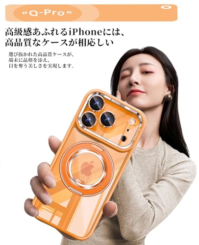 DAMESINE iPhone 17用ケースMagsafe対応 マグネットリング回転スタンド付き 透明アクリル背面 シリコン耐衝撃 滑り止め 耐黄変 カメラコントロールボタン キラキラなカメラカバー着脱可能 かわいいあいふおん17ケース オレンジ