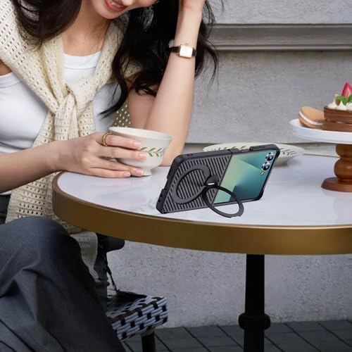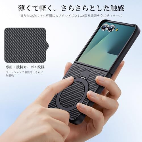 Aunote Galaxy Z Flip7 用ケース 回転リングデザイン + 炭素繊維風テクスチャー 衝撃吸収 マグネット対応 米軍MIL規格 ギャラクシーzフリップ7 カバー ブラック