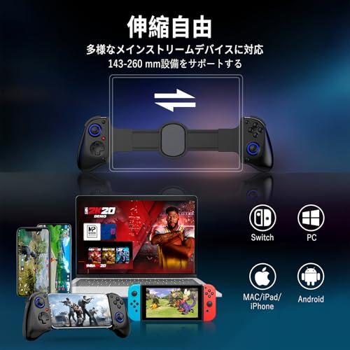 【広範な設備互換性】無線コントローラは左右の引張構造を設計し、143-260 mmの引張可能な長さを調整でき、大多数のスマートフォン、タブレット、Switch、PCなどを含む多種の設備と互換性がある。この汎用互換性は、あらゆるデバイスで素晴らしいゲーム体験を楽しむことができることを意味します。