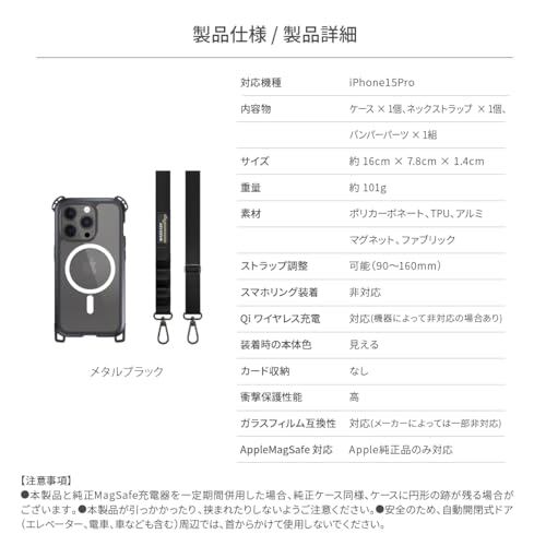 【製品仕様】… ◆ 対応機種 : Apple iPhone 15 Pro ( アップル アイフォン15プロ / アイフォン15Pro ) ◆ 内容物 : ケース × 1個、ネックストラップ × 1個、バンパーパーツ × 1組 ◆ サイズ : 約 16cm × 7.8cm × 1.4cm ◆ 重量 : 約 101g ◆ 素材 : TPU、ポリカーボネート、アルミ、ファブリック、マグネット