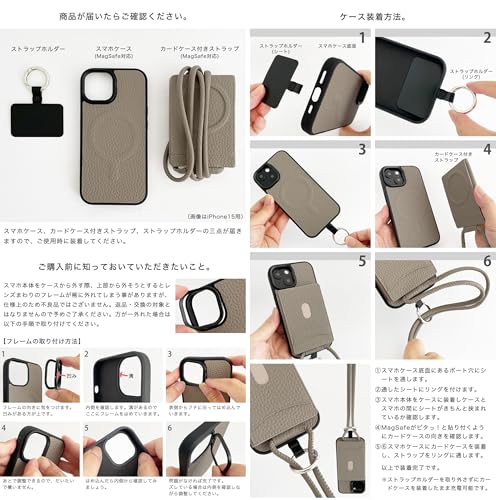 【仕様】MagSafe対応スマホケースです。ケース本体は耐候性や耐熱性に優れたポリカーボネートを採用。更に人工スエードを貼り付け高品質の素材とスマートフォン本体をしっかり保護します。側面はスムーズに着脱ができるシリコンでボタンを覆うフルカバーの仕様になっており、下部に丸ひもタイプのストラップホールが付いています。 【ロングストラップ】長さ 約63cm(全長約126cm) ※長さの調整不可 【カードケース】MagSafe対応・カード5枚まで収納可能 【スタンド機能】レンズまわりのフレームをスマホスタンドとして使用できます。※カメラホールにスタンド機能付きのフレームを付けているので、カメラホールの形状は機種に関わらず正方形となっております。