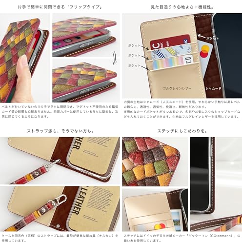 【素材】本体(外側)・ストラップ : カーフレザー(生後6か月以内の子牛の皮をなめしステンドグラスをイメージしてデザインした模様をエンボス加工)複数回による多色カラーリングのあとに全体をエナメル塗装したイタリアンレザー カードポケット : フルグレインレザー(牛皮革) 本体(内側) : シャムード(人工スエード) 内側ケース : PC(ポリカーボネート)またはシリコン ステッチにはドイツの手芸糸老舗メーカー「ギッターマン(GÜtermann)」の縫い糸を使用。商品の特性上、柄などの表情が一つ一つ異なります。不規則な色合いも個性の一つとしてご理解ください。エナメル加工は防水(撥水)効果があり汚れにも強い特徴がありますが、色移りしやすいもの(ジーンズや藍染めなど)から100%防止できるわけではございません。お取扱いには十分ご注意ください。