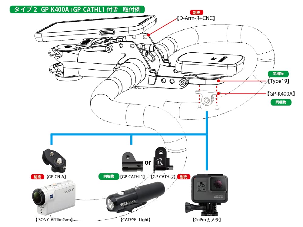 タイプ19・各種ブランド用 両持ちナロータイプがモデルチェンジ 第三世代に・タイプ2 GP-K400A+GP-CATHL1付き・ゴープロインターフェイスのある下部アダプター【GP-K400A】が付属。
