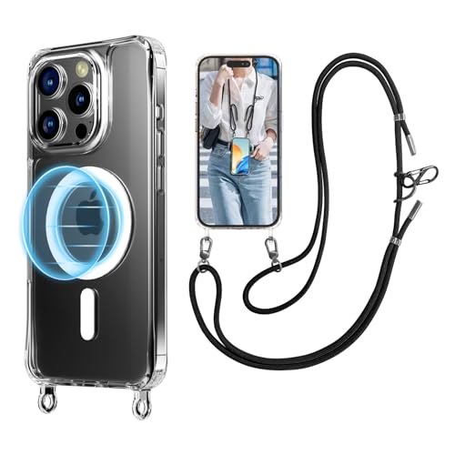 UnnFiko For iPhone 15 Pro ケース MagSafe対応 クリア マグネット式スマホケース ネックストラップ 155cm長さ調整可能 取り外し可能 細いロープ 薄型 軽量 紐付きレンズ保護 ネックショルダー 肩掛け 斜めかけ アイフォン 15 Pro ケース(iPhone 15 Pro,クリアケース+ブラックストラップ)