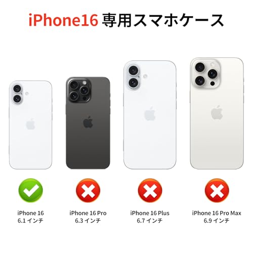 【対応機種】手帳型背面カード収納スマホケースはiPhone 16 (6.1インチ)にのみ対応しています。ご注意: iPhone 16 Plus(6.7インチ)、iPhone 16 Pro(6.3インチ)、iPhone 16 Pro Max(6.9インチ)には対応していません。
