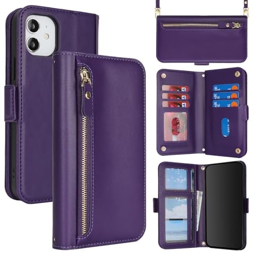 for iPhone 12 Pro ケース アイホン 12pro 肩がけ 首掛け 斜め掛け ファスナー ストラップ付き ショルダーケース 手帳型 CASE カバー SunYoo カード収納 横置き スタント PUレザー 財布型 for iPhone12 Pro パープル