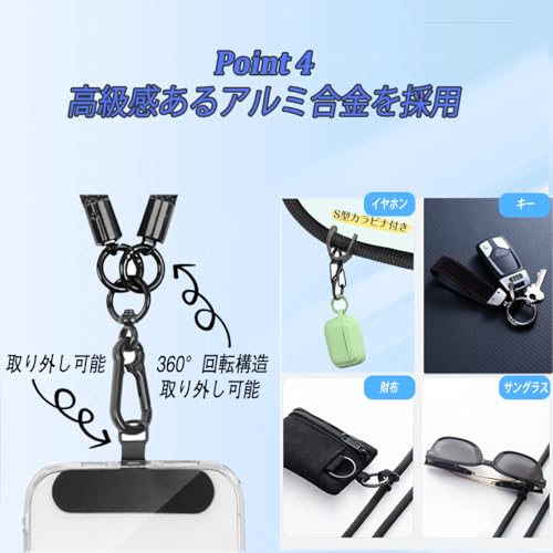 ⭐【丈夫で耐摩耗性抜群!】 ①ロップ部分は高品質なパラコードを使用することで非常に丈夫で柔軟性があります。太いタイプので、肩が痛くなりにくい。②フック部分は高級航空アルミニウム合金素材を採用し、錆が出ない、回転・取り外し可能。③ホルダーの末端には強度アップのためDカンが付属、不意に落とす心配なし!