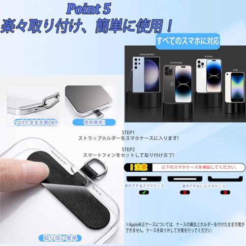 ⭐【取り付けカンタン!】 1セットにはストラップホルダーが3枚付!接着剤はない、スマホケースに挟むだけでカンタンにスマホストラップを付けられます。ホルダーをつけたまま有線・ワイヤレス充電OK!機種変更してもまた使えます!(※ケースの下部が全面開いている形状のは装着不可)それに、鍵などの持ち運びに便利なS型カラビナも付属!