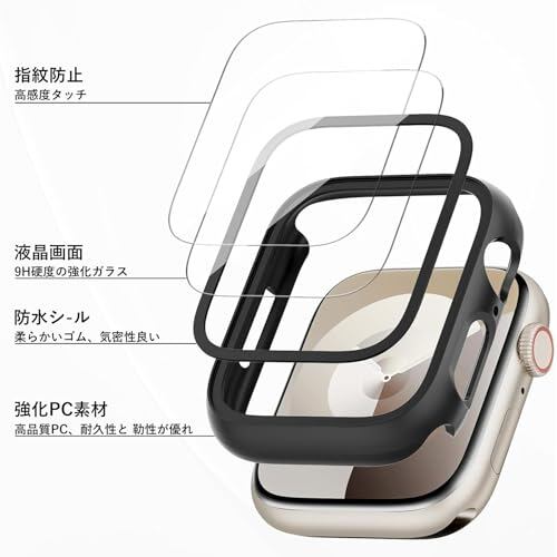 【4個入り】Apple Watch 用 ケース Series 9/8/7/SE/6/5/4/3/2/1 アップルウォッチ保護カバー 強化ガラス 一体型 PC素材 全面保護 超薄型 耐衝撃 高耐久 高透過率 指紋防止 傷防止 防水 装着簡単 (ブラック/クリア/ダークブルー/ダークグリーン, 44mm)