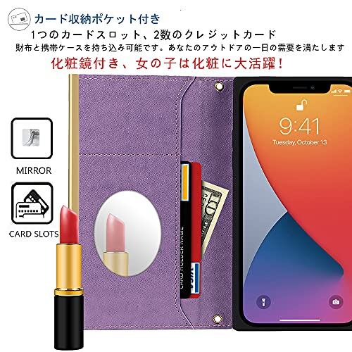 【手軽なお支払い】カードホルダーは本のデザインを採用しており、、収納しやすく、クレジットカードや現金で買い物したり、お支払いしたりしやすいです。重いカバンが嫌いな女性と男性にとっては、絶対に良い携帯保護ケースです。(2種類の携帯方式:手にかけることもできますし、肩にかけることもできます。)