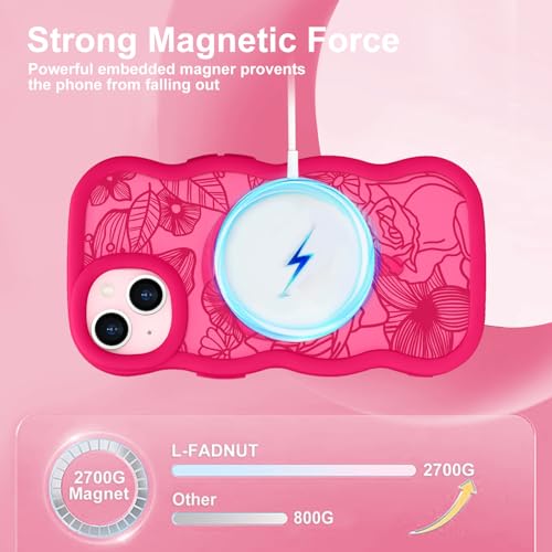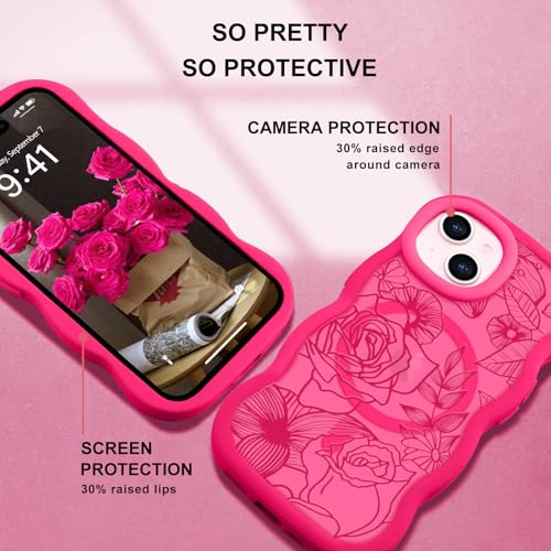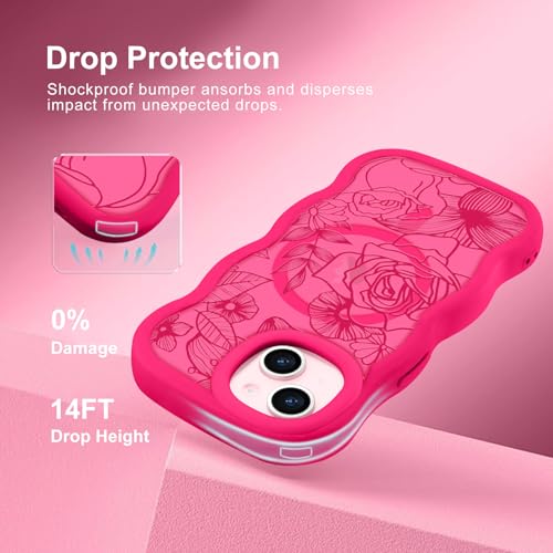 Pepmune iPhone 14/iPhone 13 用 ケース MagSafe対応 半透明 ウェーブ 花柄 耐衝撃 滑り止め 指紋防止 スマホケース 可愛い 人気 おしゃれ 波型 ワイヤレス充電対応 保護ケース 軽量 バンパー いphone14/いphone13 用 カバー (ローズレッド)