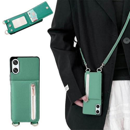 Xperia 10 VI ケース 高質レザー Xperia 10 VI カバー 肩掛け 首かけ 斜めがけ SO-52C ケース ショルダー エクスペリア 10 IV ケース ミラーケース SOG07 ケース 便利 カードポケット スタンド機能 落ち着いた色 調節可能 軽量 多機能 縦置き ICカード収納 財布型 耐衝撃 携帯 鏡付き ケース グリーン