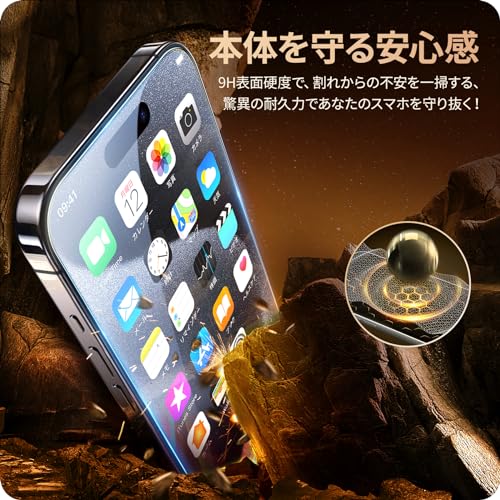 【米軍規格・傷や衝撃に強い】米軍規格「MIL-STD-810H」に準拠(認証番号:SZXEC23002005001)・9H表面硬度ガラスを採用しています。スマートフォンがカバンの中で、鍵などの鋭いものにぶつかっても傷が付きにくく、スマートフォンの画面をしっかり保護します。飛散防止加工により、万一割れてもガラス破片が飛び散ることなく安心です。