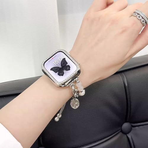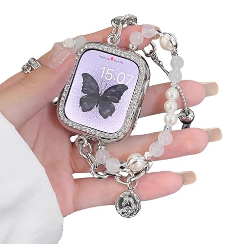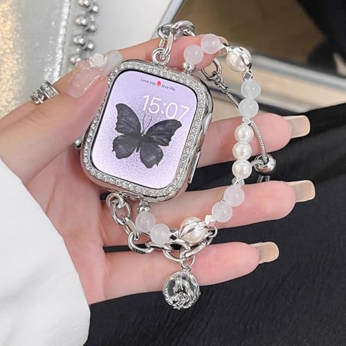 [PANDA MONO] コンパチブル アップルウォッチ バンド かわいい レディース おしゃれ 可愛い 女性 ステンレス 交換ベルト マーメイド クリスタルパール 春 夏 長さ無段階調整 通気 防汗 Watch Series Ultra/Ultra 2/10/9/8/7/6/SE/5/4/3/2/1 に対応 (ホワイト, 49mm/45mm/44mm/42mm/46mm(Series10))