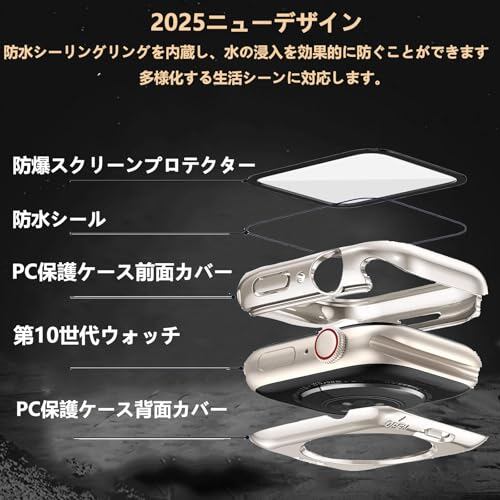 【360度防水設計】AIYYXX For アップルウォッチ カバー Series 10/9/8/SE2/SE/7/6/5/4 46mm ガラスフィルム+PCフレーム 一体型 2 in 1 前後の保護 IP68 防水 アップルウォッチ10 カバー 対応 高透過率 キズ防止 指紋防止 簡単に取り付け・取 全面保護 apple watch 10 ケース(Series 10,46mm,スターバースト)