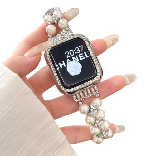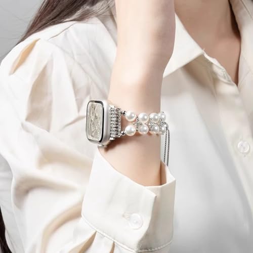 [PANDA MONO] コンパチブル アップルウォッチ バンド 49mm 46mm 45mm 44mm 42mm 41mm 40mm 38mm ステンレス 交換ベルト おしゃれ 可愛い 女性 レディース クリスタルパール 長さ無段階調整 通気 防汗 Watch Series Ultra/Ultra 2/10/9/8/7/6/SE/5/4/3/2/1 に対応 (パールホワイト, 49mm/45mm/44mm/42mm/46mm(Series10))